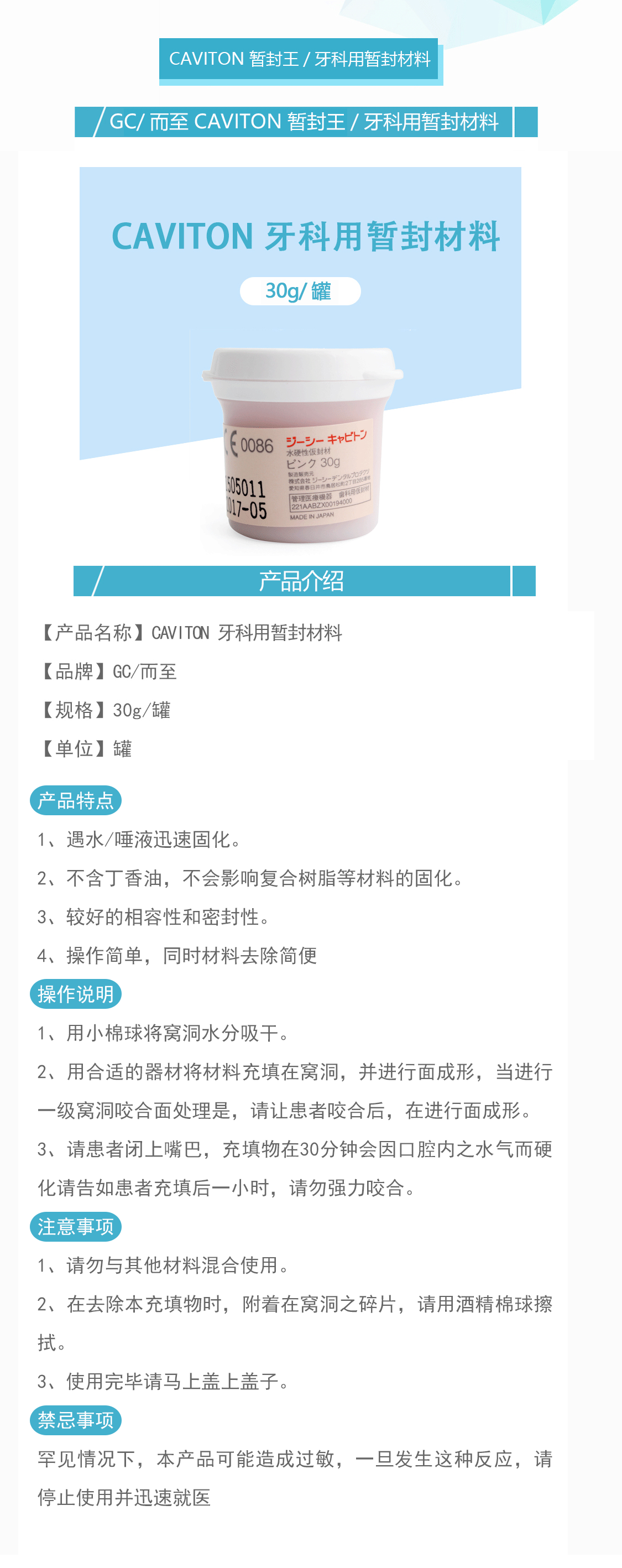 产品名称:GC CAVITON暂封王/牙科用暂封材料