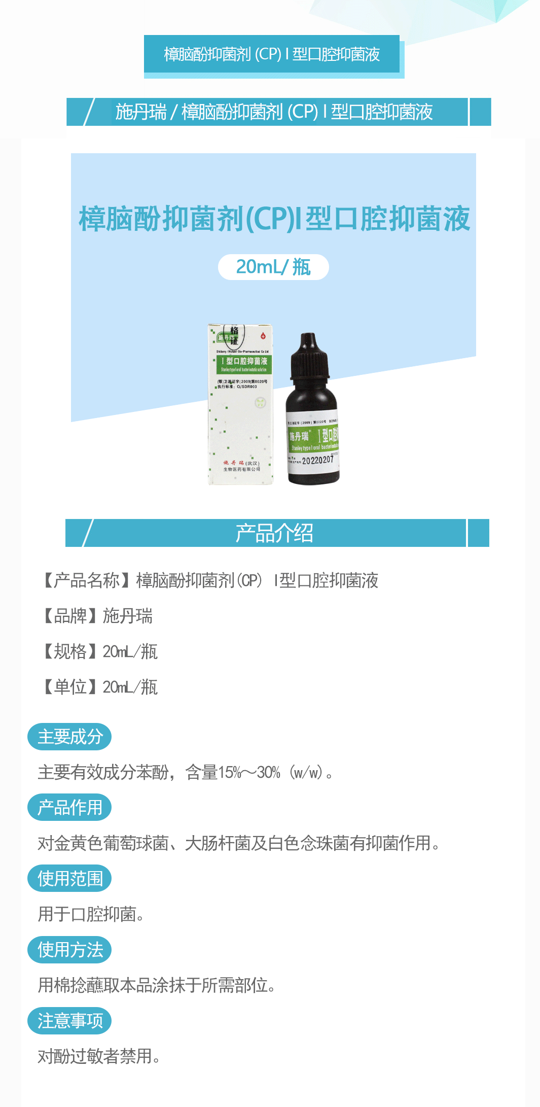 产品名称:樟脑酚抑菌剂(CP) I型口腔抑菌液