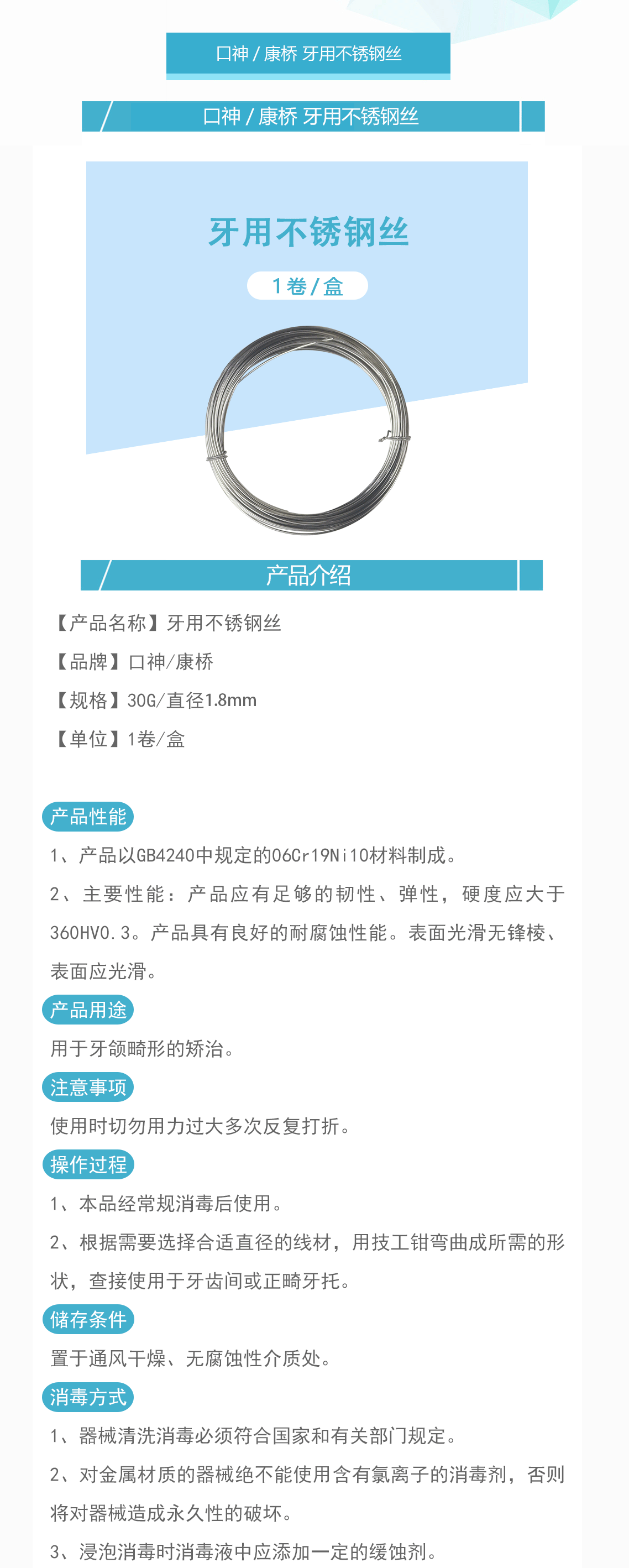 产品名称:牙用不锈钢丝 30G