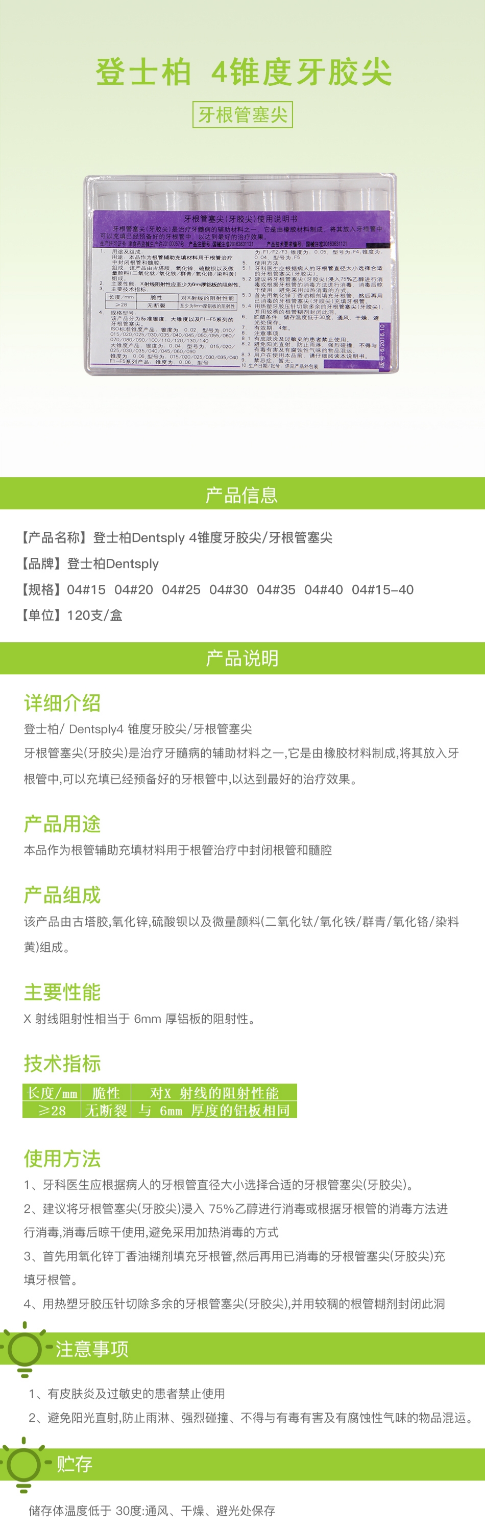 产品名称:登士柏 牙根管塞尖/大锥度牙胶尖