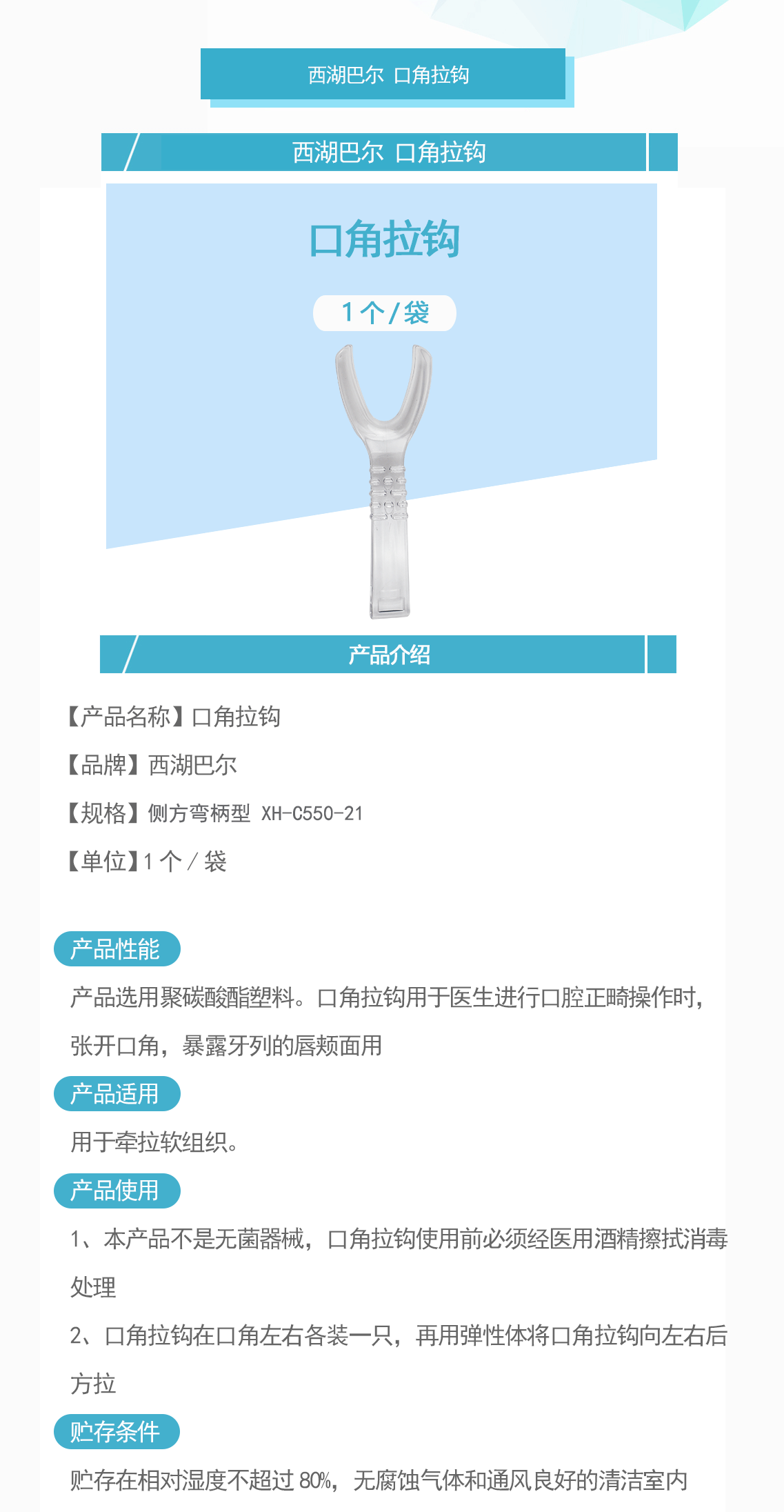 产品名称:口角拉钩 侧方弯柄型