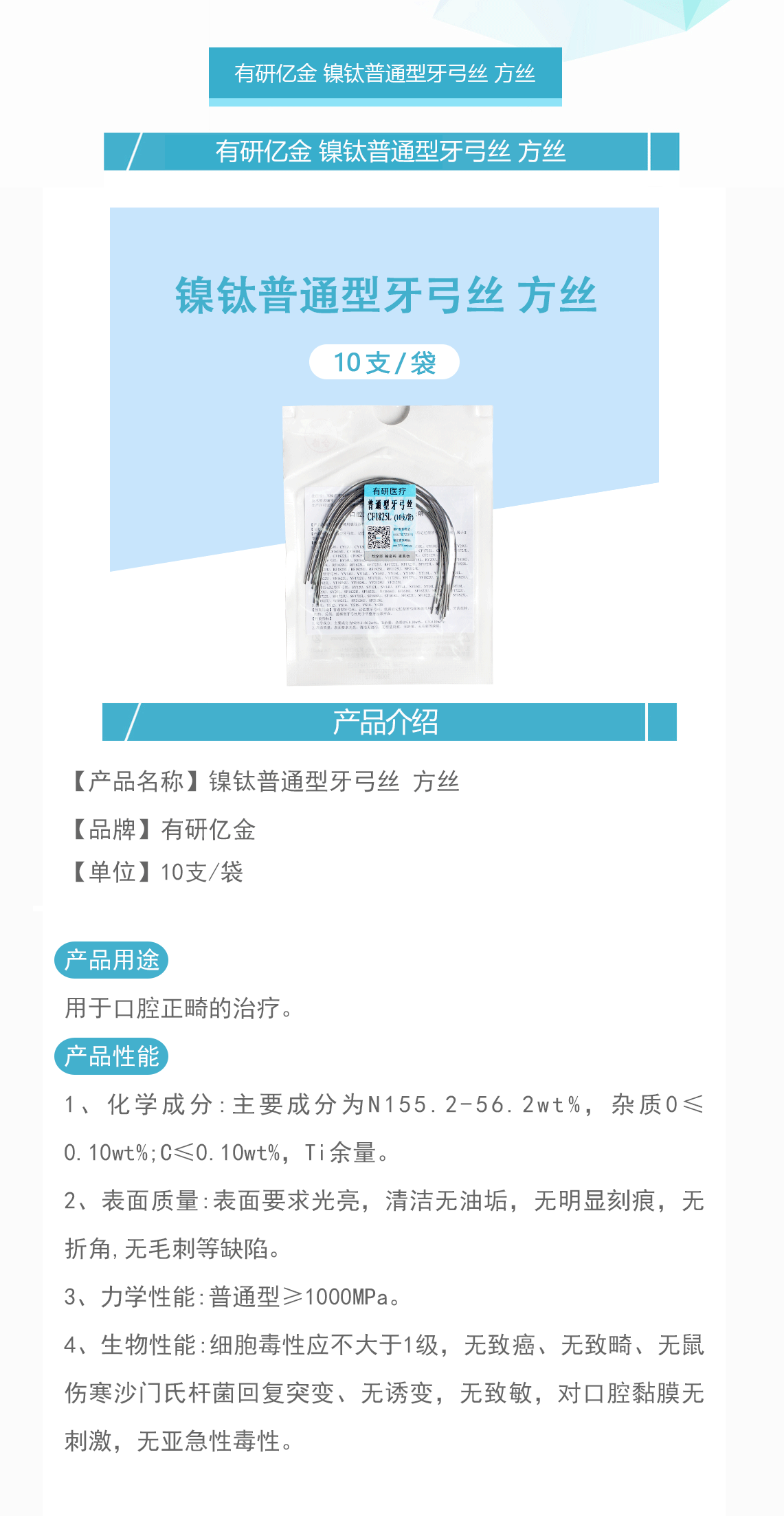 产品名称:镍钛普通型牙弓丝 方丝 方圆形