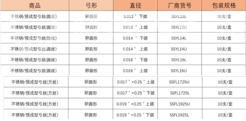 有研亿金 镍钛普通型牙弓丝 圆丝,方圆形 10支/袋