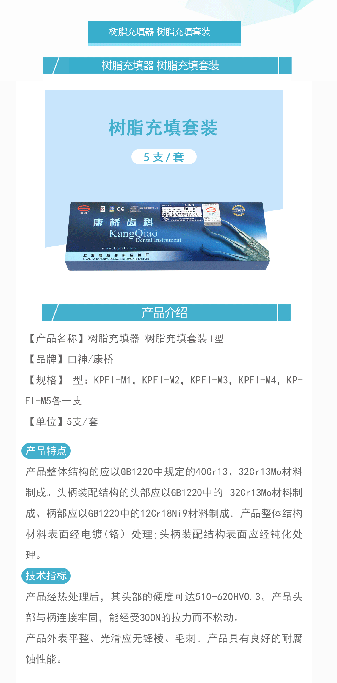 口神/康桥 牙科树脂充填器套装 II型,5×1(镀层)