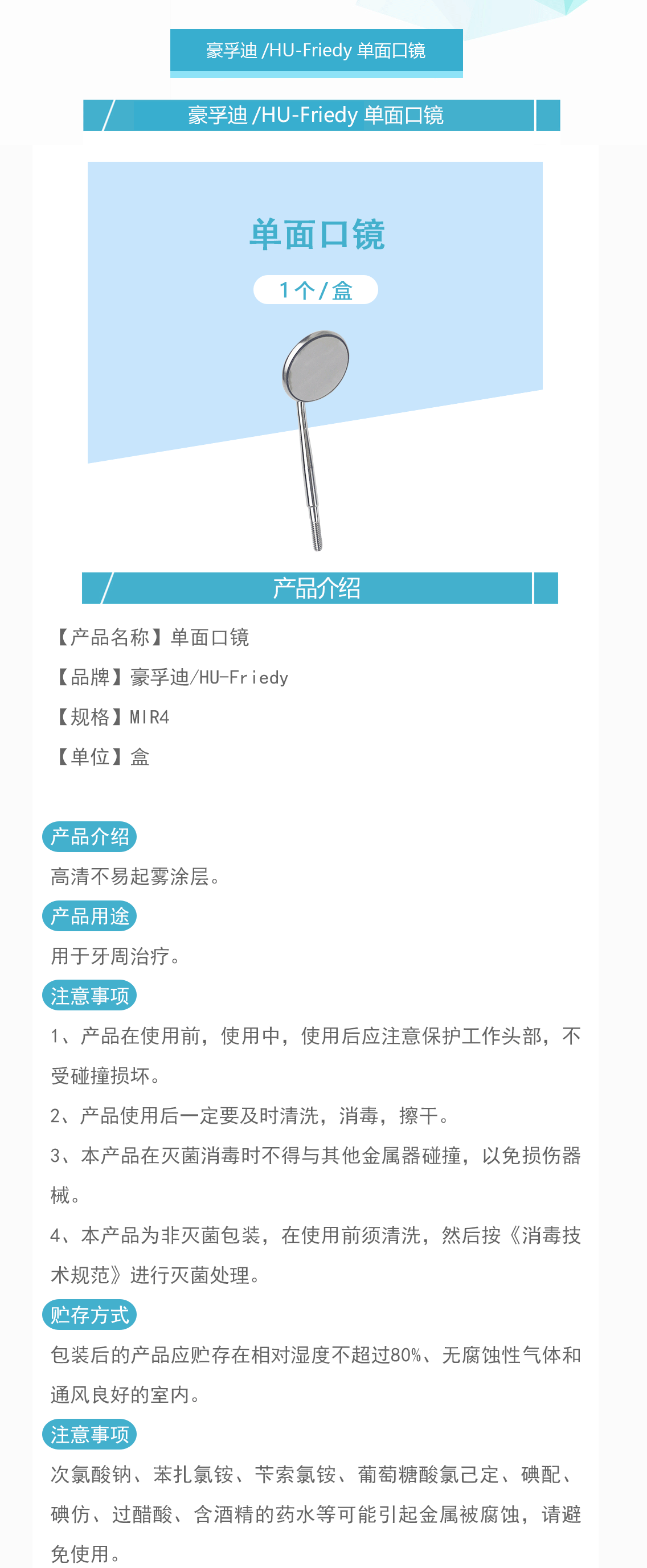 豪孚迪/HU-Friedy 单面口镜 MIR4 1个/盒