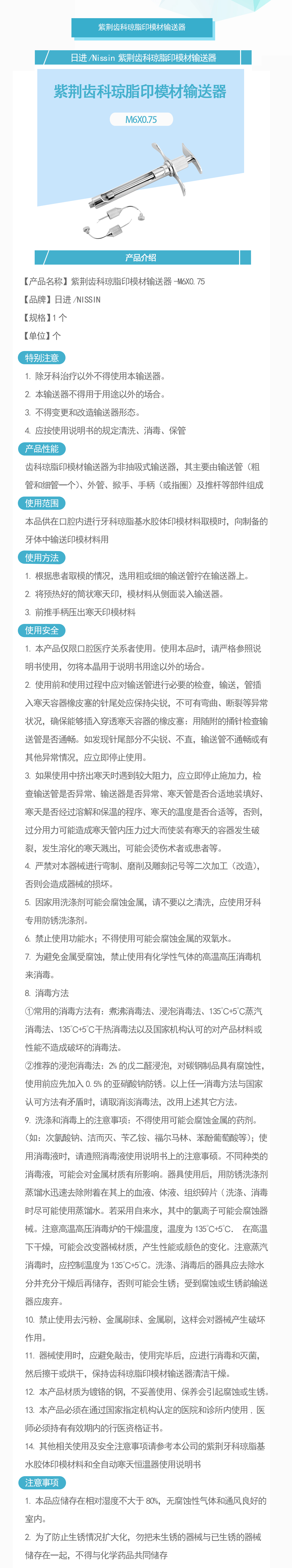 日进/Nissin 紫荆齿科琼脂印模材输送器M6X0.75,含粗、细输送管各1个