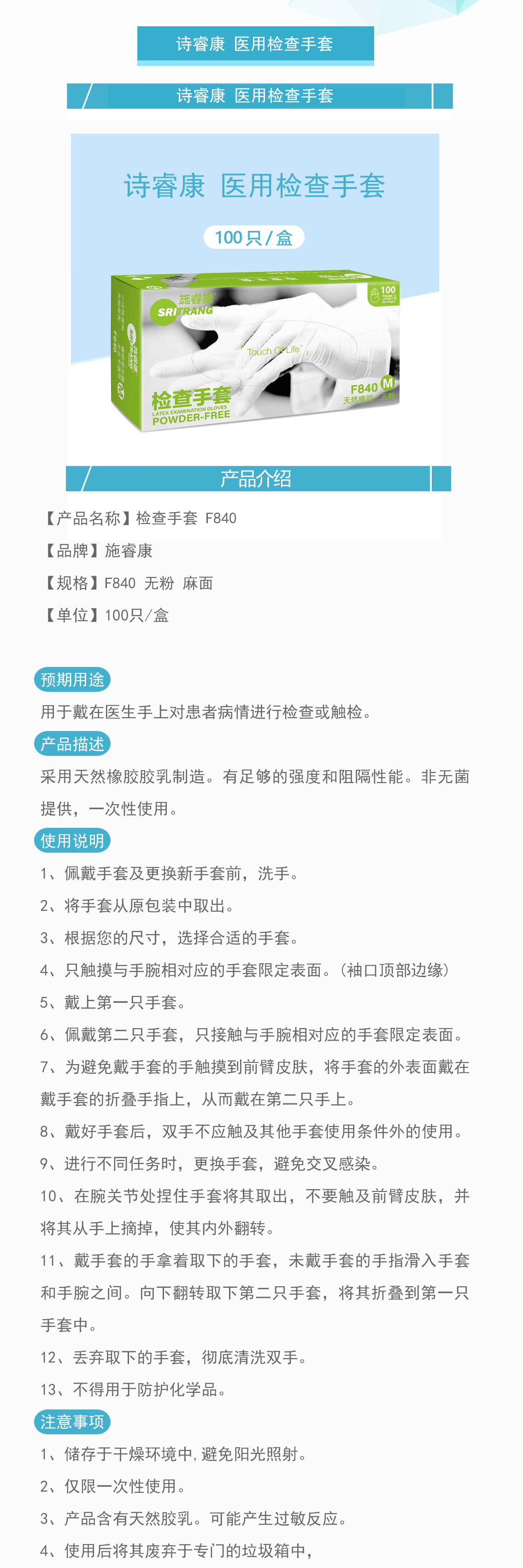 产品名称:医用检查手套无粉 麻面 F840
